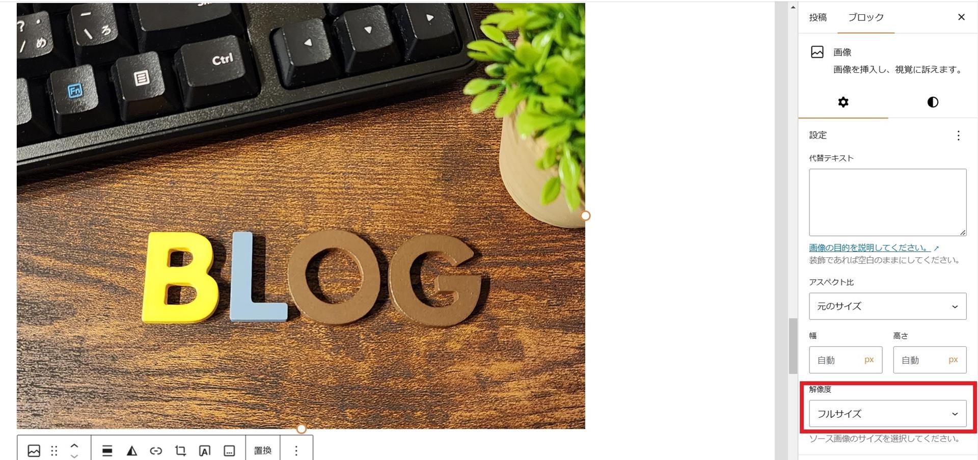 WordPressをインストールした初期設定だと、画像を挿入するときの解像度は「大」となっています(テーマによって変わる場合があります)。